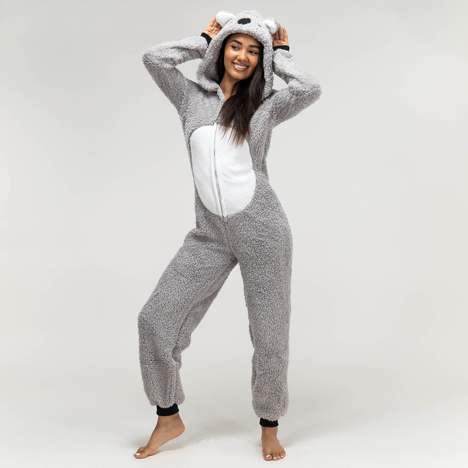 Állatot Mintázó Női Egyrészes Plüss Kezeslábas Koala, méret: S-XL, Szürke / Fehér– Big Bertha Original HU